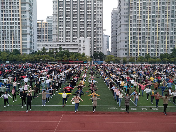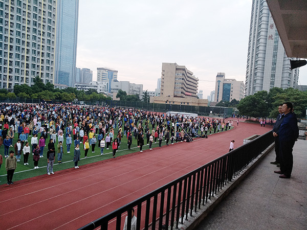 10月15日晨光初泛,伴随着出操音乐的响起,2018级全体学生分别来到校本部和南校区的体育场,拉开了新学年升国旗唱《国歌》仪式和早锻炼活动的序幕。校党委副书记刘群英全程观看早操活动,随后又深入教室,查看一、二年级学生晨读情况,对同学们认真晨读的良好精神风貌表示满意。