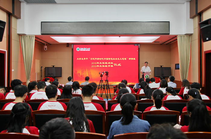 6月19日下午,我校在知行楼一楼会议室举办大学生骨干“习近平新时代中国特色社会主义思想”研修班2018年主体班结业典礼暨2019年主体班开班式。校党委书记李俊出席并讲话,校党委副书记刘群英主持活动。