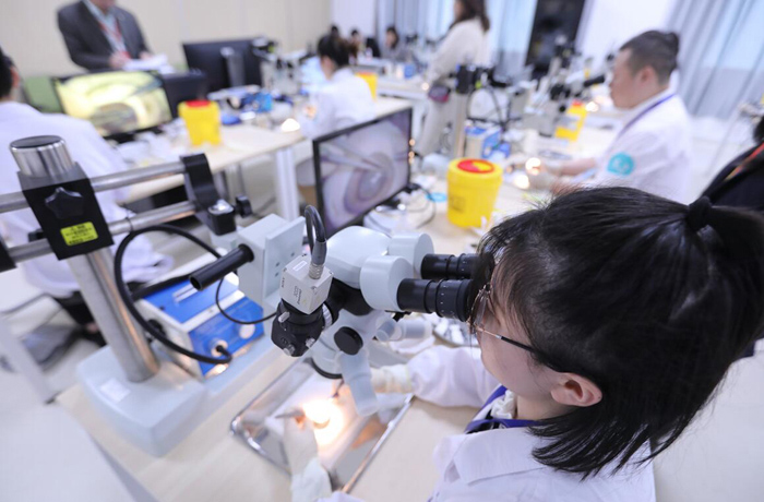 决赛分临床科研课题设计、眼科显微手术技能赛、病例汇报和科普作品展示4个环节,比赛过程精彩纷呈、跌宕起伏、竞争异常激烈。最引人瞩目的第二环节“眼科显微手术技能赛”中,我校选手全神贯注、气定神闲,用细如发丝般的缝合线熟练操作,在20分钟规定时间内对猪眼角巩膜伤口进行显微缝合,完美表现征服了评委并获得全场最高分。第四环节,他们以设计新颖、富有创意的小品《西游新编》,将对眼疾患者远离虚假广告与产品、科学防控近视的温馨提醒融入幽默的表演中,赢得了评委和全场观众的好评。