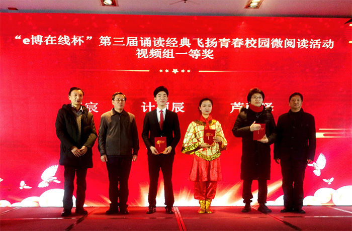 12月5日,“e博在线杯”第三届“诵读经典飞扬青春”校园微阅读主题创作大赛决赛在合肥举行。我校2016级临床医学(5+3)专业的计雨辰同学入围决赛,并以精彩的现场表现荣获视频组一等奖,我校图书馆获最佳组织奖。